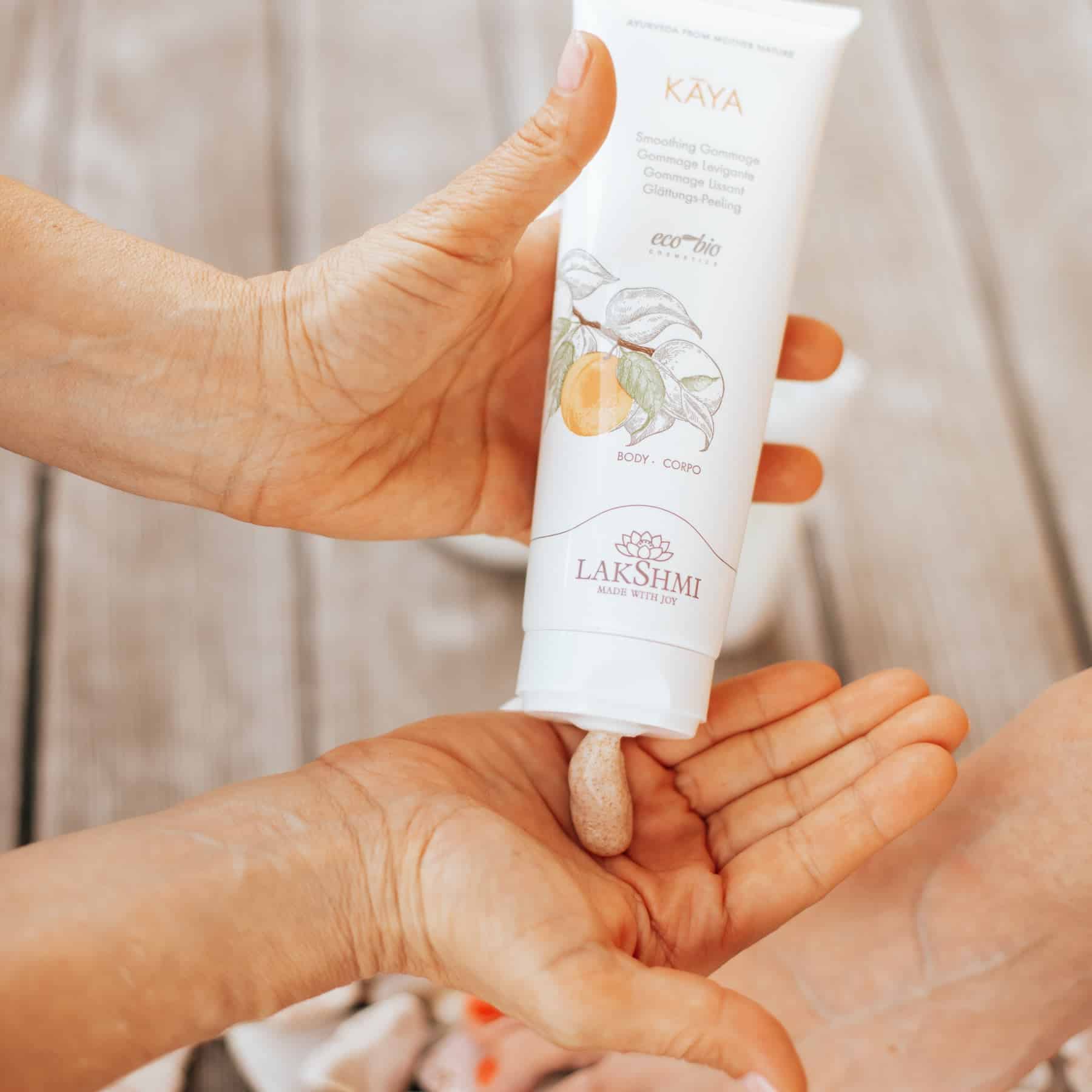 - Lakshmi Kaya Body Scrub: Omdat het heel belangrijk is dat de werkzame stoffen de diepte in gaan en je daarvoor de dode huidcellen goed wilt verwijderen van je lichaam