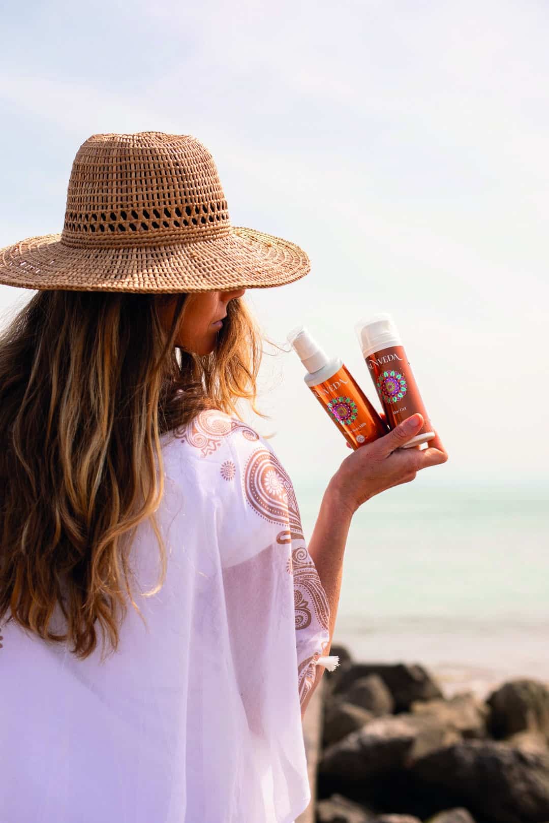 Zonbescherming op basis van natuurlijke filters en ayurvedische kruiden. Licht, voedend en zonder witte waas.